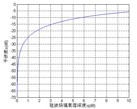 电视接收机具有自动增益控制(AGC)功能,其控制能力约60dB~70dB,只要合成场强的变化范围(即:驻波衰落深度η)在AGC的作用范围内,由于载频的微小频差导致驻波相位漂移所产生的接收信号场强波动即可以被抑制。干涉度α与驻波场强衰落深度η关系见下图。
