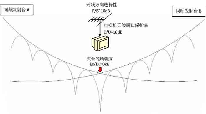 在Ed=Eu的完全等场强区:接收天线方向选择性提供D/U=10dB的同频保护率