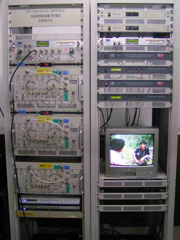 试验数据表明: 1. 非同步状态(普通电视广播)的RFPR=52dB,与ITU和国标的参数相符; 2. 单纯载波锁定同步,“百叶窗”消除,存在运动“鬼影”,RFPR=22dB; 3. 载波锁定同步,节目信号的行频与场频同步,行/场相位随机定位,即“鬼影”固定的准电视同步广播状态,RFPR=15dB; 4. 载波锁定同步,同时节目信号实现精确时统同步控制,即“鬼影”与接收图像重合的电视精密同步广播状态,RFPR=10dB。 四. 电视精密同步广播现场开路试验 电视精密同步广播现场开路试验在江西702、705、708台之间进行。参加试验的发射机均为10KW,工作于DS-22频道。