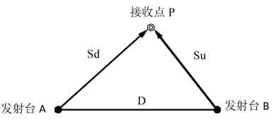 同频道工作的两部电视发射机,在它们的共同覆盖区内,有任意接收点P,P点与主收发射机(A)的距离为Sd,P点与干扰发射机(B)的距离为Su。当两部发射机同步工作时,即载频相对频差⊿F→0时,两部发射机的载波在接收点P的相位差: