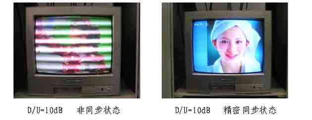 电视精密同步广播技术的实现,就是基于上述理论分析结果。电视精密同步广播发射台之间同频干涉区的合成电波近似为稳定的驻波形态,微小的载频偏差将导致驻波相位的缓慢漂移。当驻波的场强衰落深度小于电视接收机的AGC控制范围,且驻波相位漂移衍生的接收场强波动速率远小于电视接收机AGC的响应速率,则因载频偏差而导致的接收点场强波动,将不再对接收机重现的图像产生影响。图像载波精密锁定同步后,与非同步电视广播相比,射频保护率改善30dB,即保护率降低至RFPR=22dB。 在电视精密同步广播中,电视同频干扰的图像损伤主要来自于图像载频的差拍干扰,即“百叶窗”滚动条纹干扰。精密同步广播的发射机播送相同的节目内容(包括行频/场频完全同步),因传输路径差异形成的稳定“鬼影”不是造成图像损伤的主要因素。但是,节目传输分配的路径主要是数字卫星链路或数字光缆传输链路,数字卫星接收机或数字电视解码器“再生”的行频/场频,有可能使节目的时基产生很大的偏差(5X10-5量级),这将使“鬼影”飘动起来,从而增加了人眼对“鬼影”干扰的敏感度。尤其是行、场逆程的 “消隐十字”,在移动中会相当程度地影响图像质量。解决这个问题的措施是对节目信号进行精确的时统同步控制,锁定同步发射机间图像信号的时序相关性。 经过电视节目信号时统均衡的电视精密同步广播系统,在D/U=0dB的完全等场强区接收电视图像,其干扰“鬼影”与欲收图像是重合的,这种“鬼影”的干扰几乎不可见。随着接收点偏离等场强区,“鬼影”与图像逐渐错位,但由于这种“鬼影”是静止的,其敏感性极低。随着偏离等场强区距离愈远,D/U亦随之提高,“鬼影”亦在随之变淡。干扰“鬼影”与欲收图像锁定了时序相关性后,在原来单纯的图像载频锁定的基础上,可以进一步改善射频保护率约12dB,即降低至RFPR=10dB。