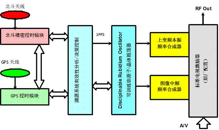 时频基准源的主同步溯源采用我国完全自主的“北斗导航”卫星系统,其同步准确度优于美国NASA的GPS系统,GPS系统则作为备份同步溯源。完全地避免了美国军方对GPS系统施加SA加扰控制的影响,以确保广播电视对高可靠性的要求。正常情况下,精密偏置系统跟踪同步於我国的北斗导航卫星系统。当出现意外情况,本溯源路径中断,系统自动切换至GPS系统继续同步工作。如果GPS系统再失效,造成系统无法跟踪溯源,可训练铷原子振荡器(或高稳晶体振荡器)则自动进入非跟踪保持状态。此时,可训练铷原子振荡器(或高稳晶体振荡器)不仅保持了跟踪溯源中断时刻的同步精度,还可以依据既往的跟踪修正历史,智能化地继续修正老化漂移误差,其漂移率优于1X10-9/年。在北斗导航卫星系统、GPS两个系统均失效的情况下,可以满足精密偏置同步继续工作2~6个月以上。 电视精密同步广播的图像信号时统同步控制,由电视精密同步广播时统同步机完成。不同路径传输至各同步发射台的图像节目信号,经由时统同步机数字化处理和存贮,在北斗/GPS溯源时频基准源复现的高精度时间基准(1PPS)与频率基准(10MHz)的时钟驱动下,准确地将图像信号的帧相位和行相位,分别与1PPS 信号和10MHz时钟粘滞同步,从而实现各同步发射台之间图像节目信号的时统同步(行/场频率与相位的精密同步)。在电视精密同步广播时统同步机中,还可以进行精确的固定延时调整,以满足不等功率发射台间等场强区位置偏置情况下的传输时延补偿修正。