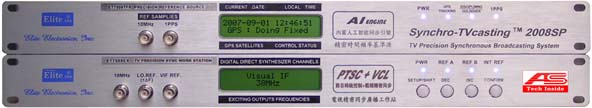 完全等场强交叠覆盖区接收示意图 电视精密同步广播的核心技术:①精密锁定各同步发射机的图像载频,消除图像载频差拍形成的“百叶窗”条纹干扰;②精确同步各发射台节目图像的行/场频率,使运动的“鬼影”静止下来变成“重影”。并且通过时统均衡控制,让各发射台节目图像的行/场相位在完全等场强交叠覆盖区一致,将接收的图像信号与干扰“鬼影”完全重合。 电视精密同步广播,同步发射机的图像载频和节目图像的时统均衡控制,需要高精度时间与频率的同步。在工程实践中,是通过GPS授时系统的溯源获得10MHz频率基准和1PPS时间基准。