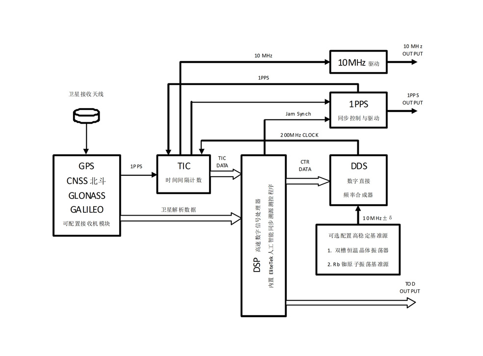 | EliteTek � 独创的Synchro-Base TM 人工智能同步溯源专利技术,是基于高速数字信号处理器技术与高精度数字直接频率合成技术(DSP+DDS),结合拥有完全自主知识产权的测控软件系统,形成了独特的高精度频率与时间的溯源同步系统。 目前,时间频率基准源广泛使用的溯源同步技术,是基于驯服控制高稳定基准源的原理。系统通过直接修正内置的所谓“可驯服基准源"的误差,以达到同步溯源的目的。但是,由于制造工艺的局限,高精度的基准源一旦成为“可驯服”的基准源,其基准源自身的稳定度将劣化0.5到1个数量级。这将极大地降低溯源授时信号中断状态下的频率与时间的精确度与稳定度。 EliteTek � 的Synchro-Base TM 系统,内置的基准源是“不可驯服”的高稳定基准源。TIC精确地检测出基准源与溯源授时信号之间的误差δ,经DSP形成控制决策,在DDS中对来自高稳定基准源的10MHz基准频率作超精细的相位调整。